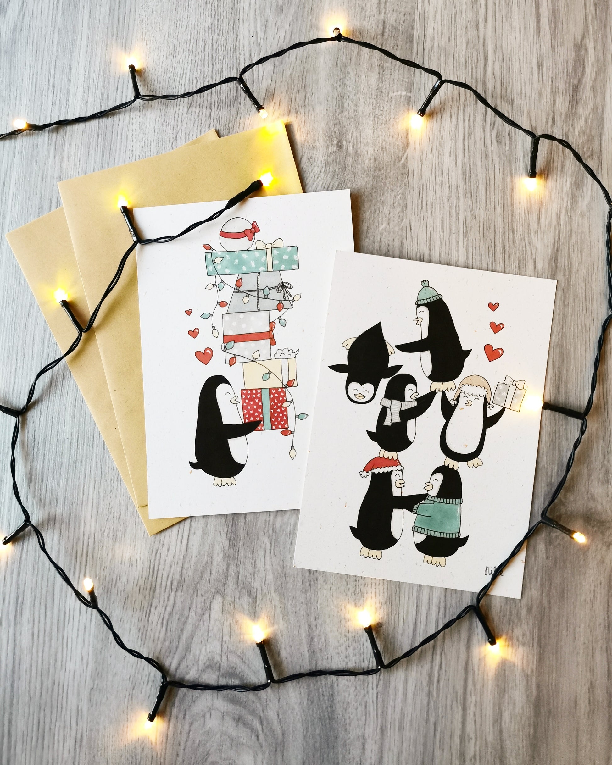 Julekortene er tegnet og farvelagt i hånden af mig og derefter trykt på 300g A5 genbrugs papir.
