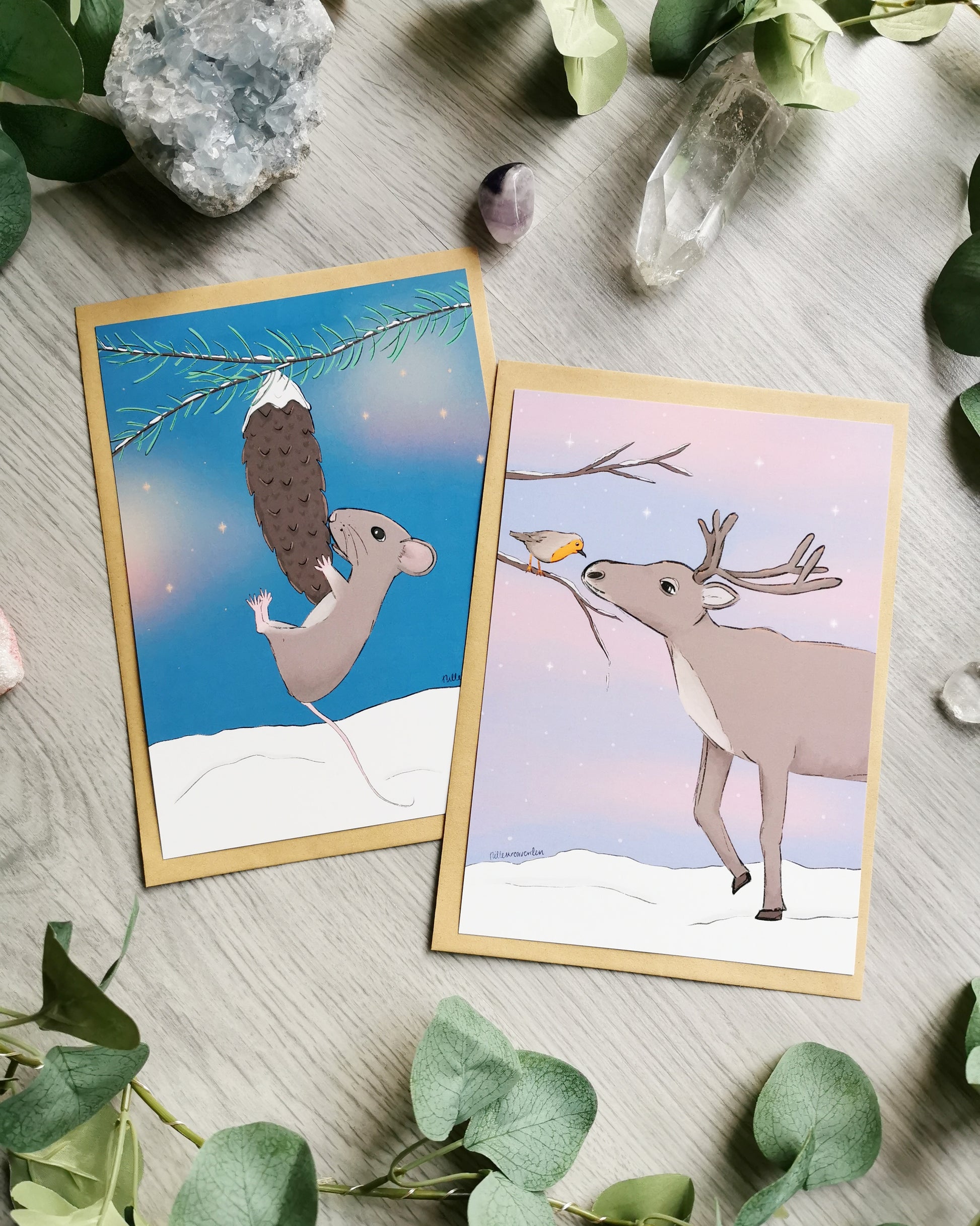 De smukke julekort er tegnet digitalt og derefter trykt på 300g A5 papir.