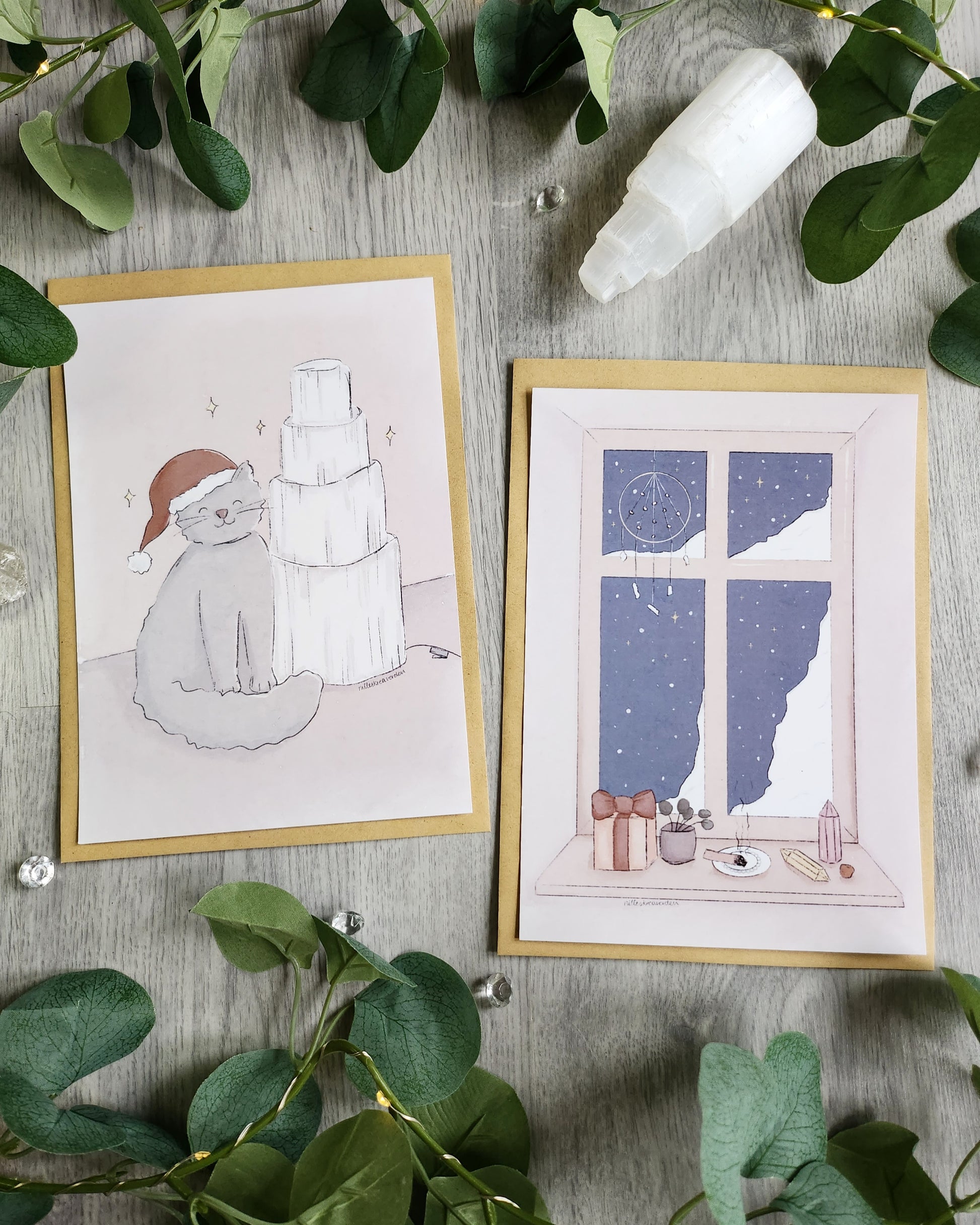 De smukke julekort er tegnet digitalt og derefter trykt på 300g A5 papir.