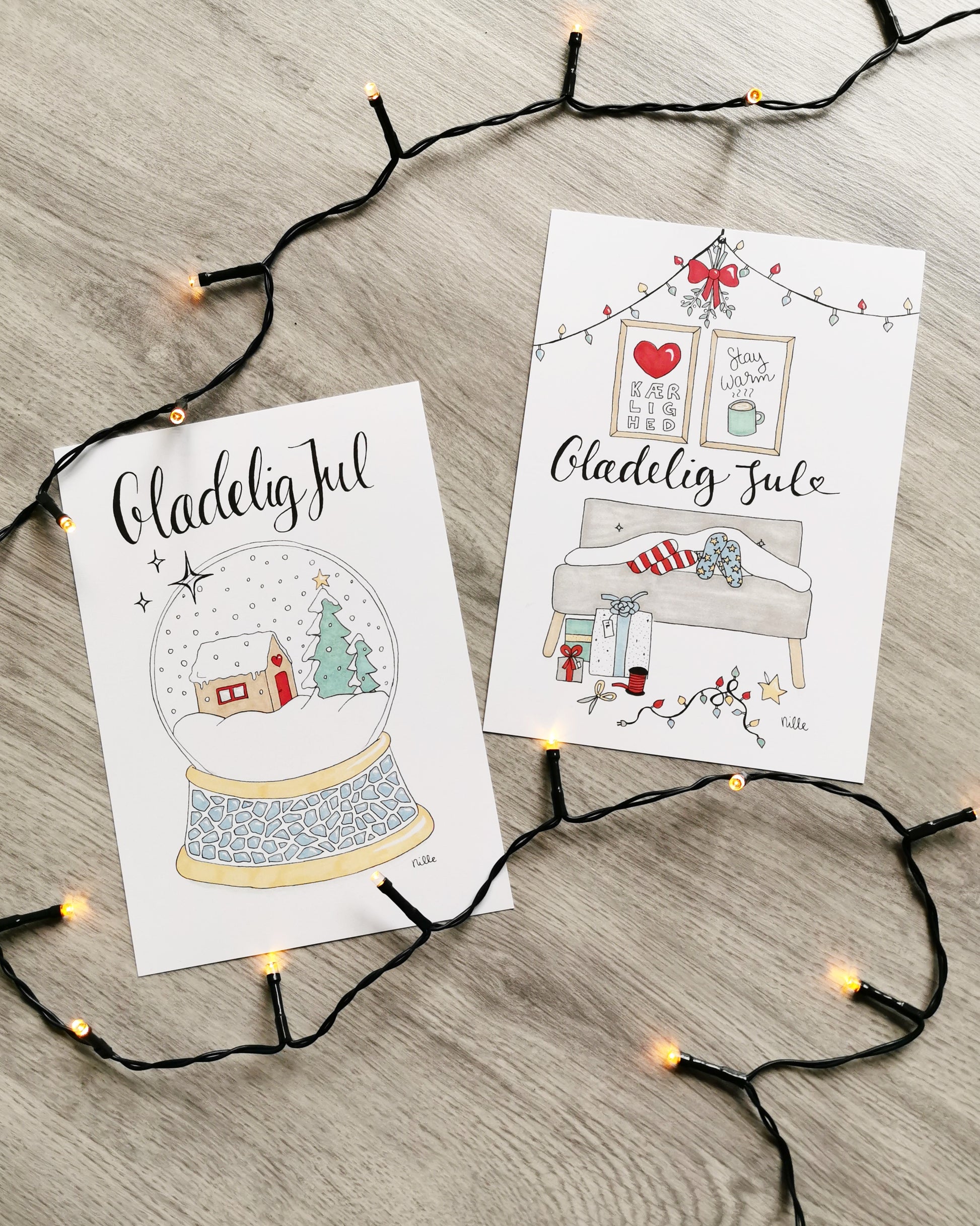 Julekortene er tegnet og farvelagt i hånden af mig og derefter trykt på 300g A5 papir.