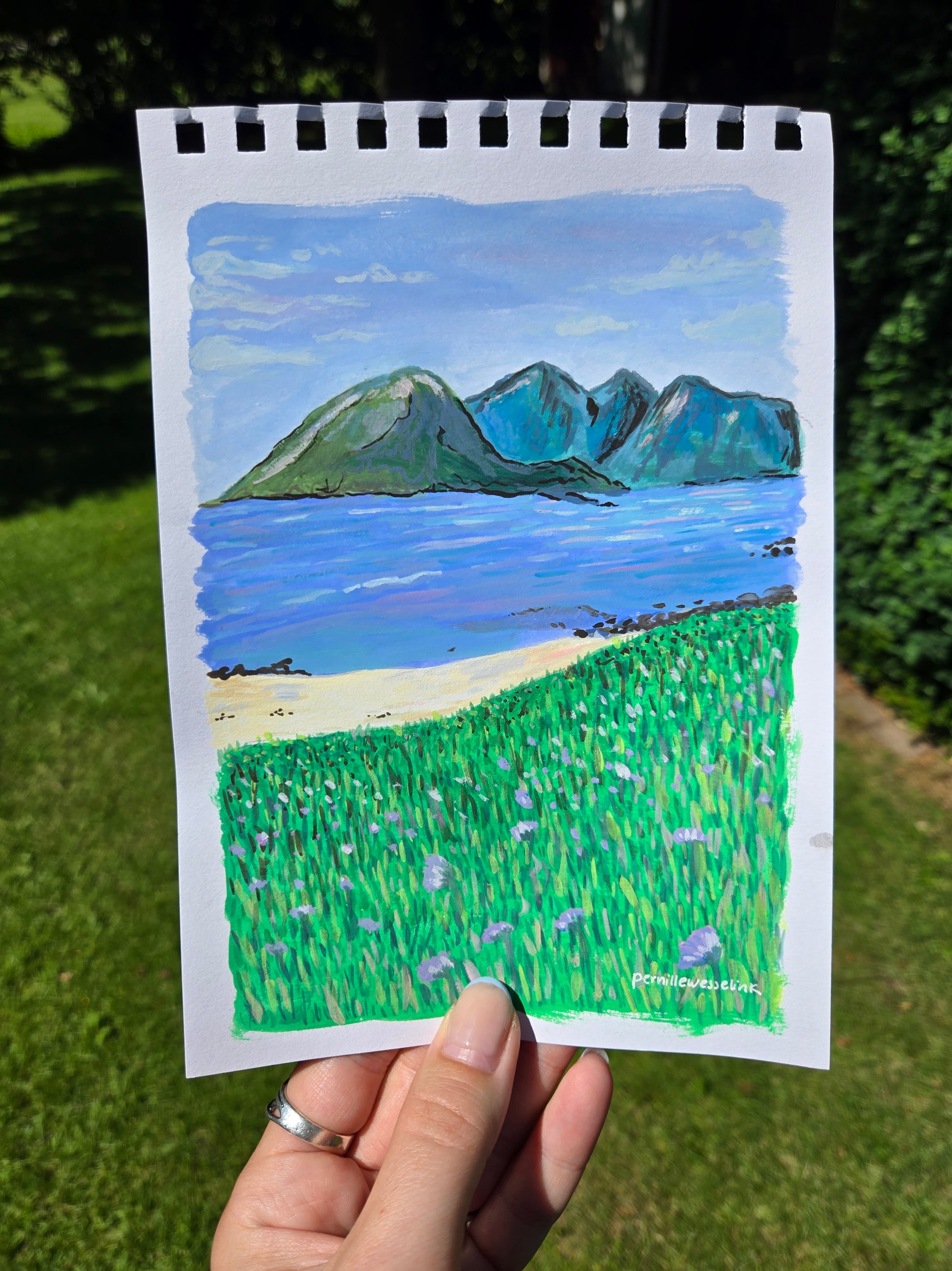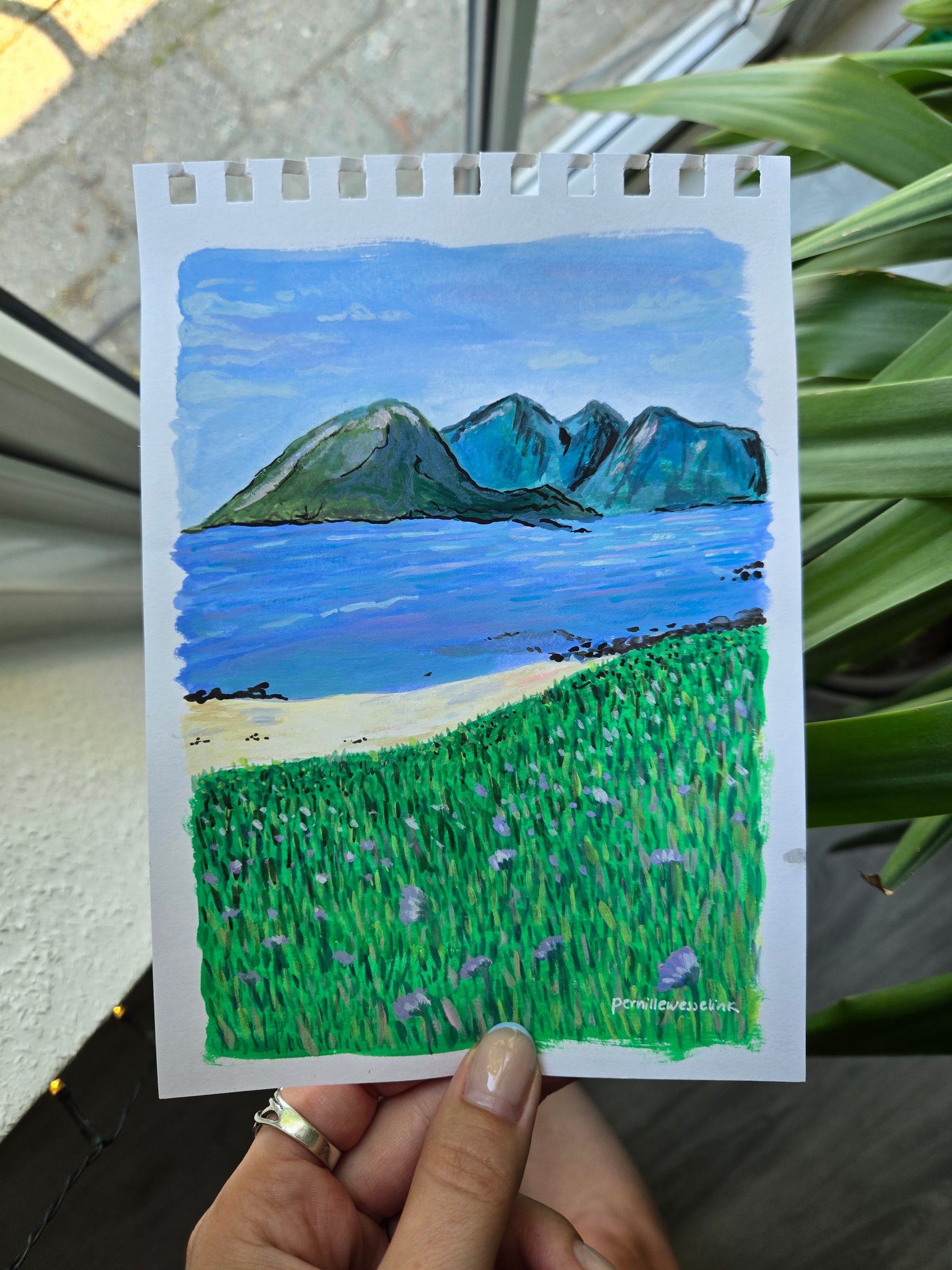Et livligt lille maleri med friske farver og naturens klare energi. Et smukt maleri i skønne farver, der bringer fornemmelsen af åbne vidder og frihed ind i rummet.
