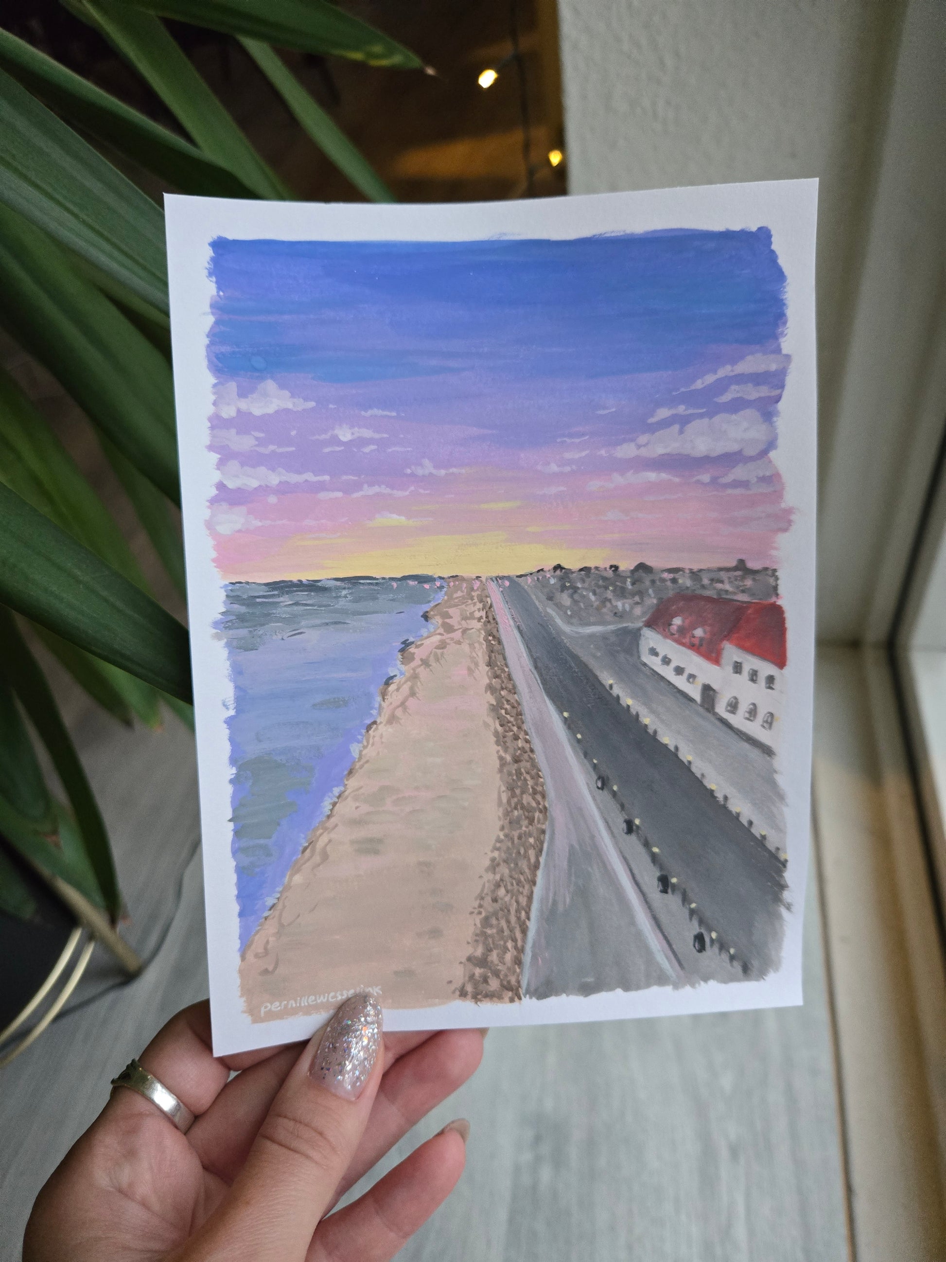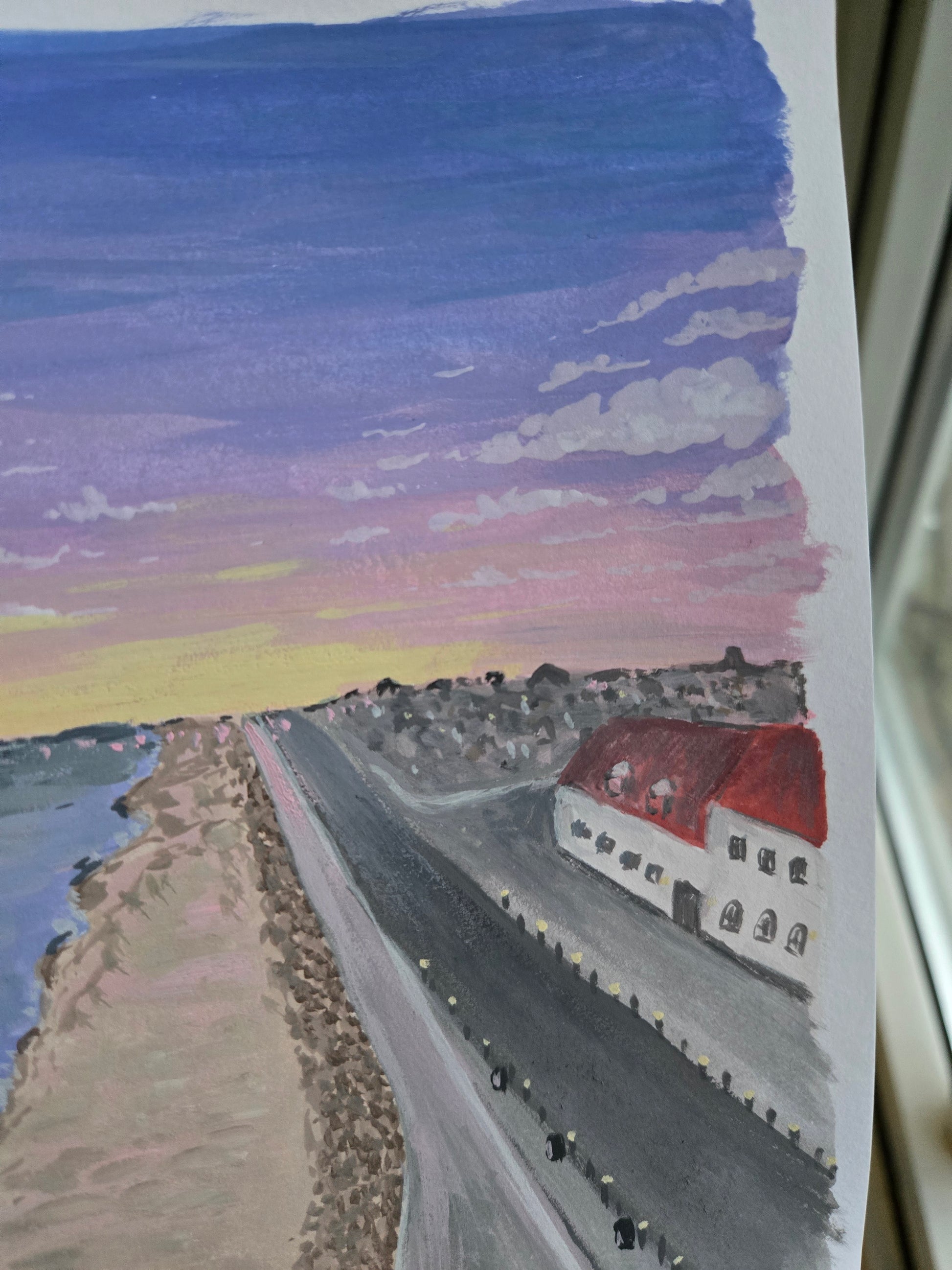 Nogle kan måske genkende hotellet. Maleriet er inspireret af Hjerting Badehotel med en drømmende solnedgang.