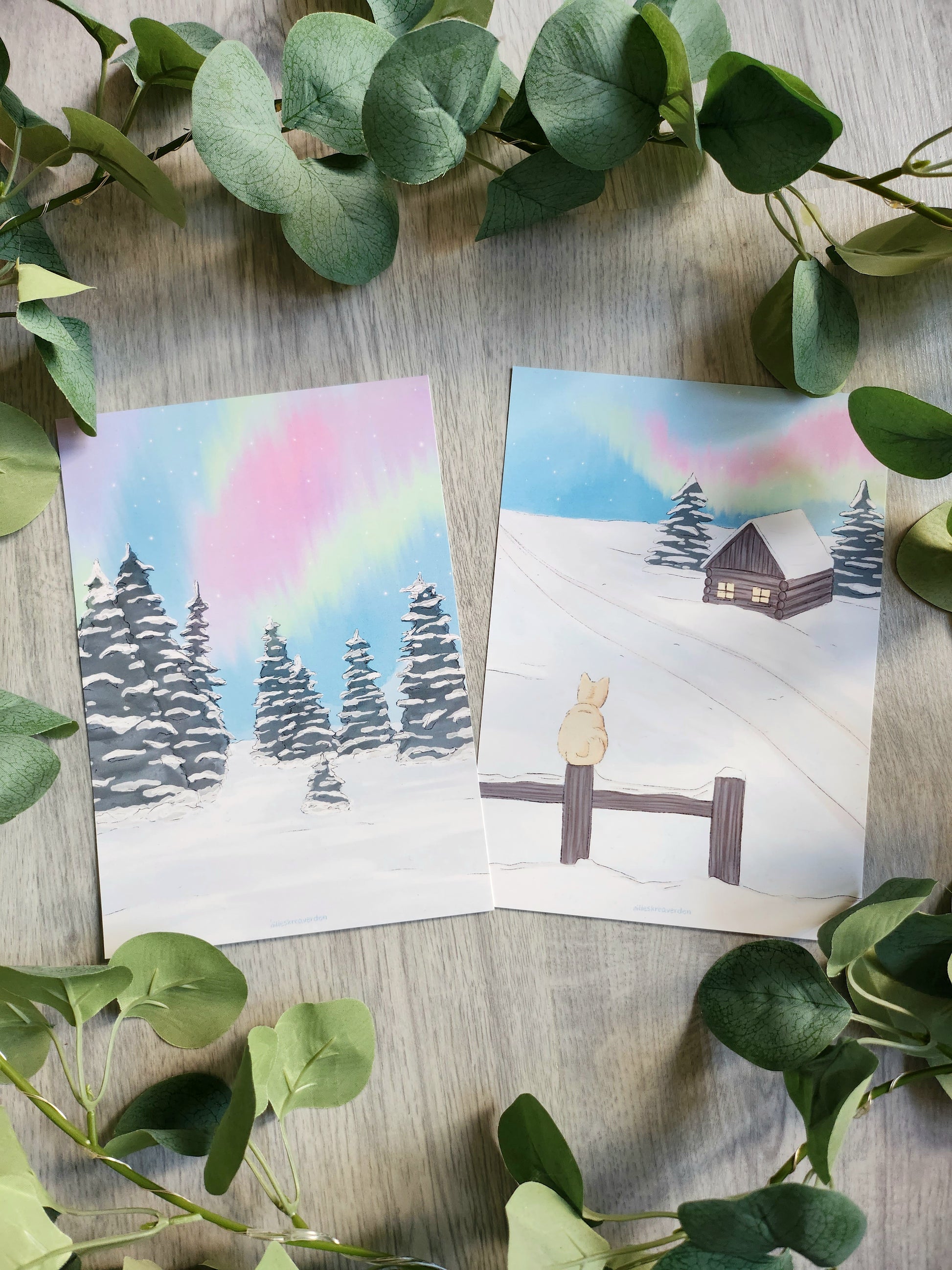 De smukke julekort er tegnet digitalt og derefter trykt på 300g A5 papir.