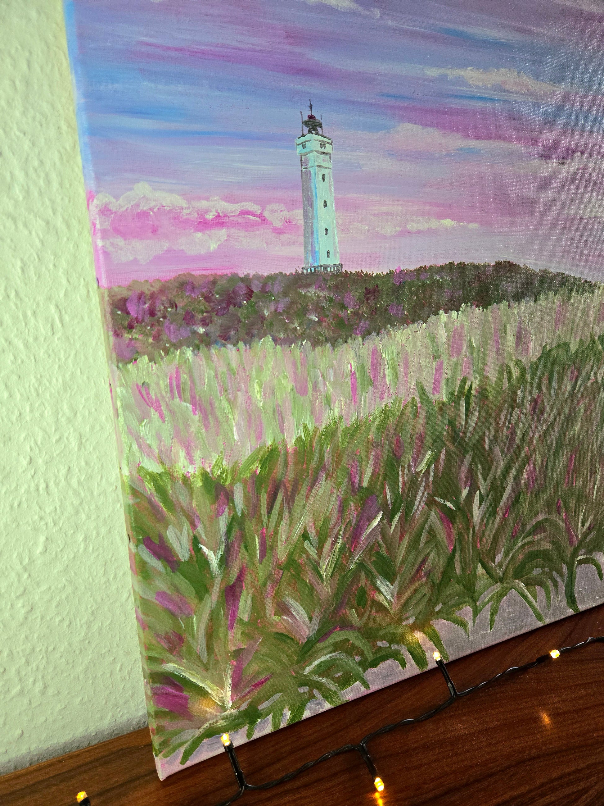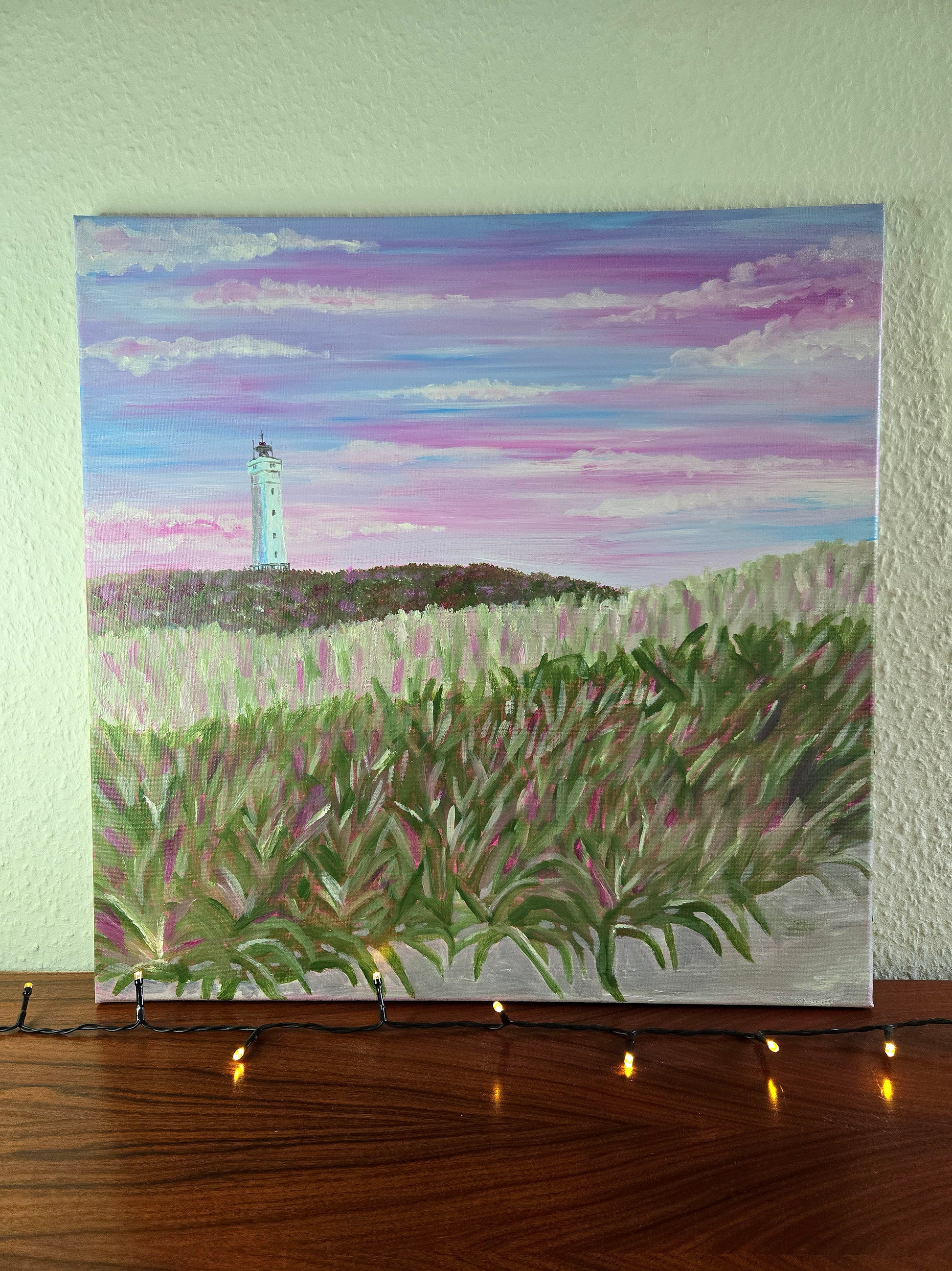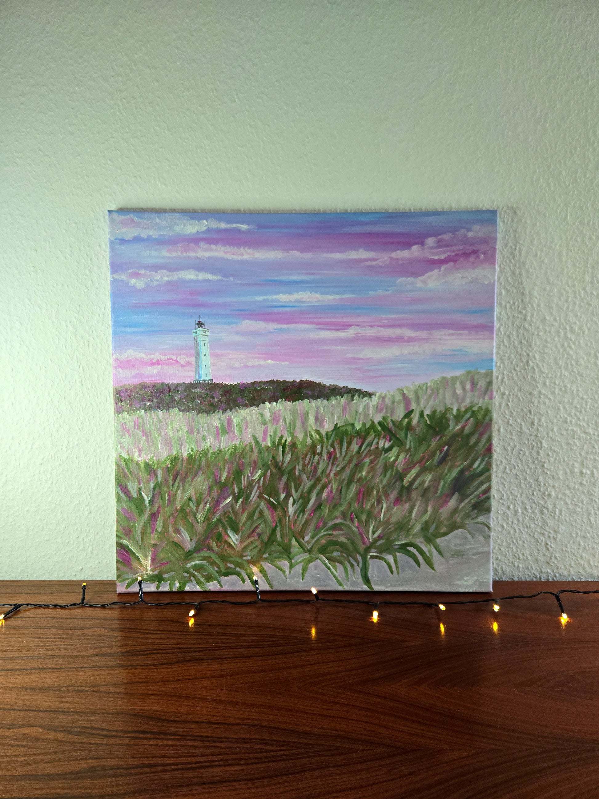 Dette maleri viser Blåvand Fyr i et drømmende udtryk, hvor den lyserøde og lyseblå himmel blidt møder enge og græs foran. Et fredfyldt øjeblik fra vestkysten, indhyllet i lys og ro.
