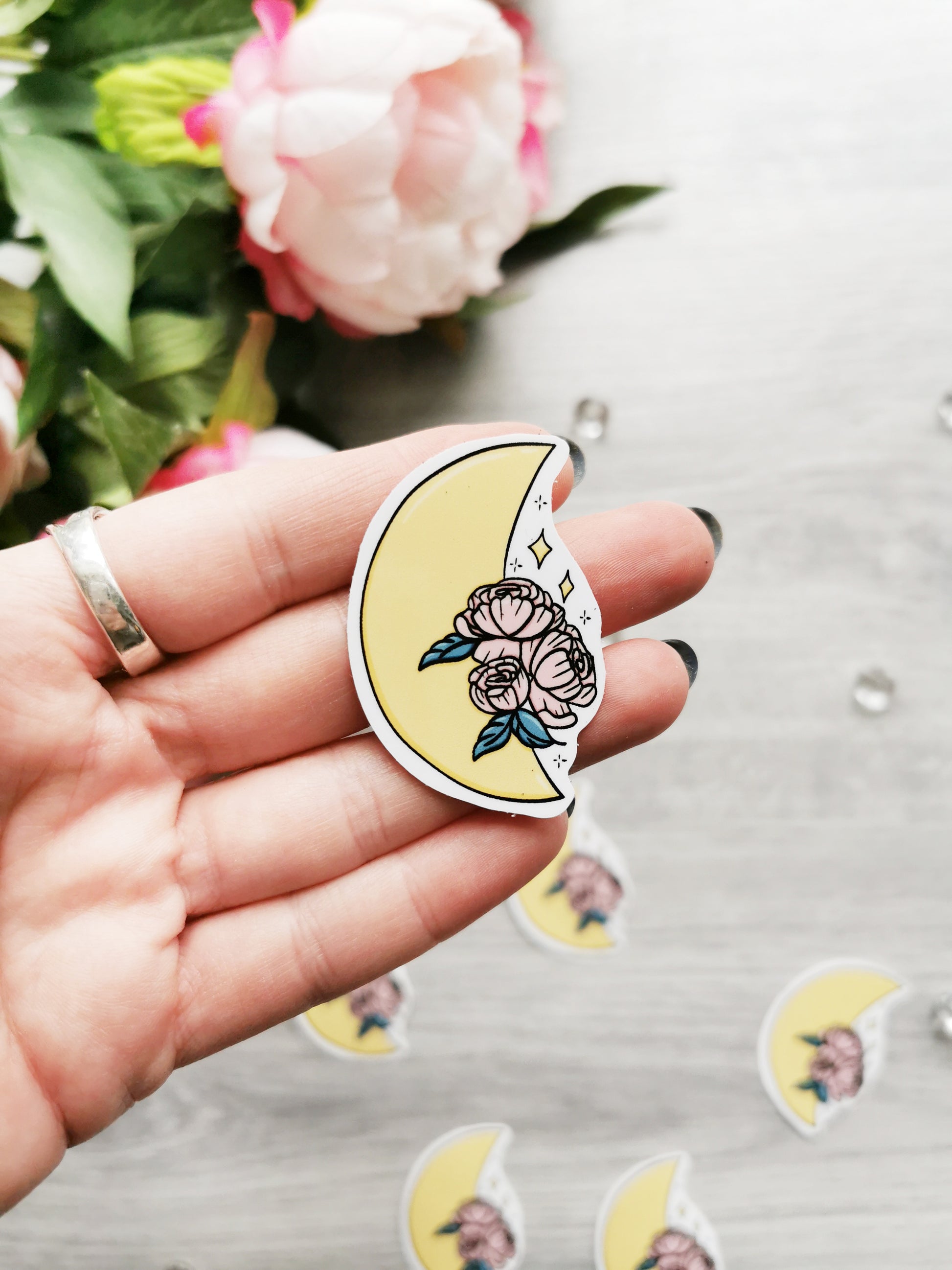 Måne m. pæon klistermærke