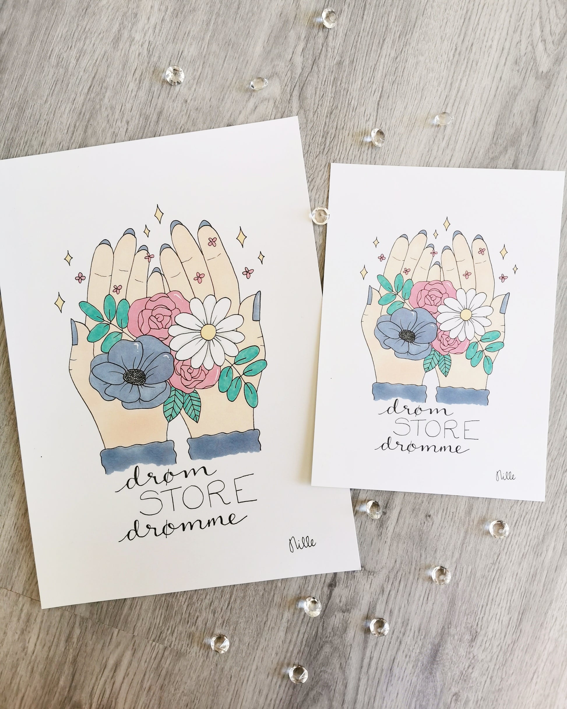 Fåes både i A4 og A5. Ved A5 er der mulighed for at få medsendt en konvolut, hvis printet evt skal bruges som kort. Hvis dette ønskes skrives det i kommentarfeltet ved betalingen.