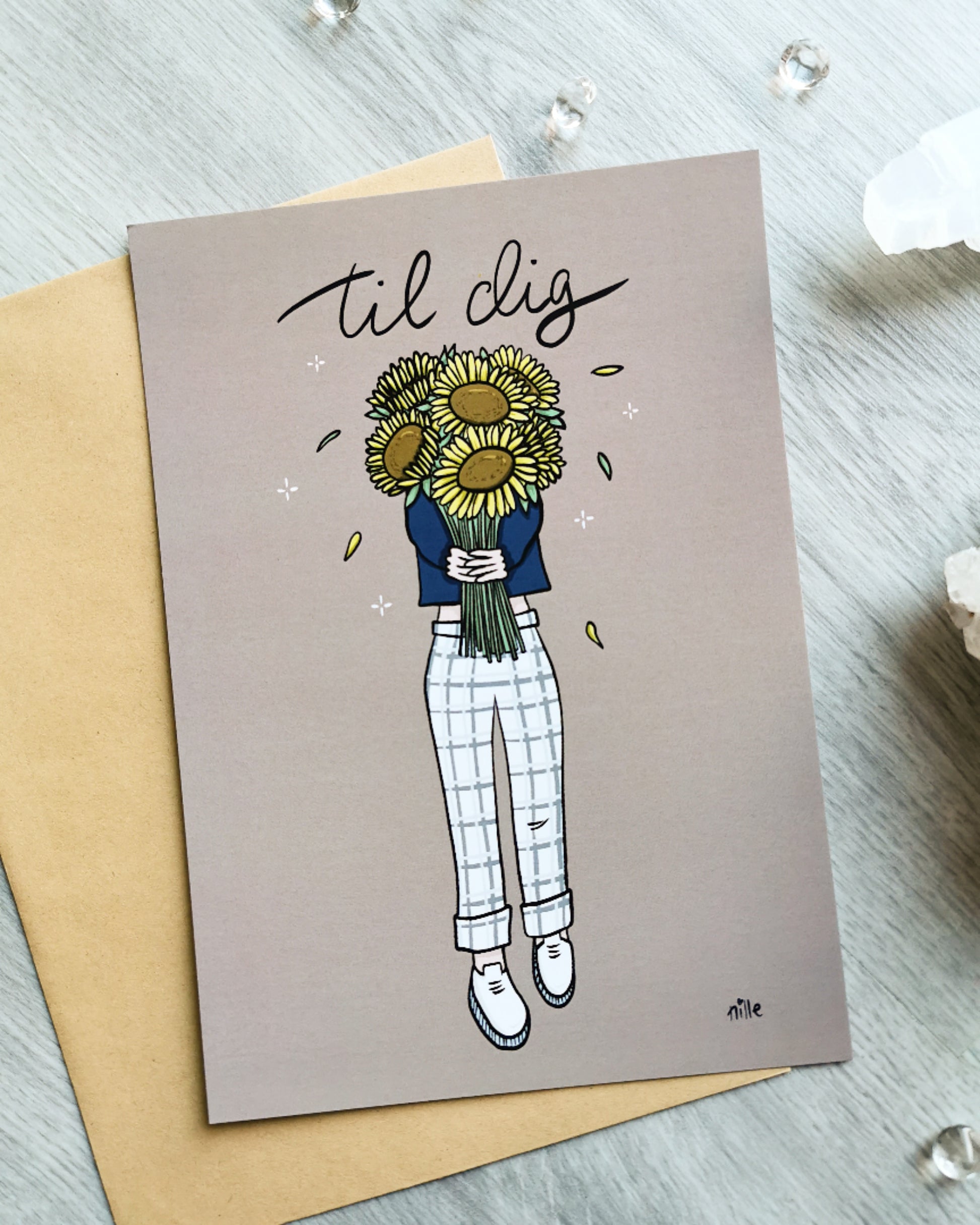 Der medfølger en brun konvolut af svanemærket. Du kan få skrevet navn udenpå konvolutten ved at skrive det ønskede navn i kommentarfeltet ved betaling.