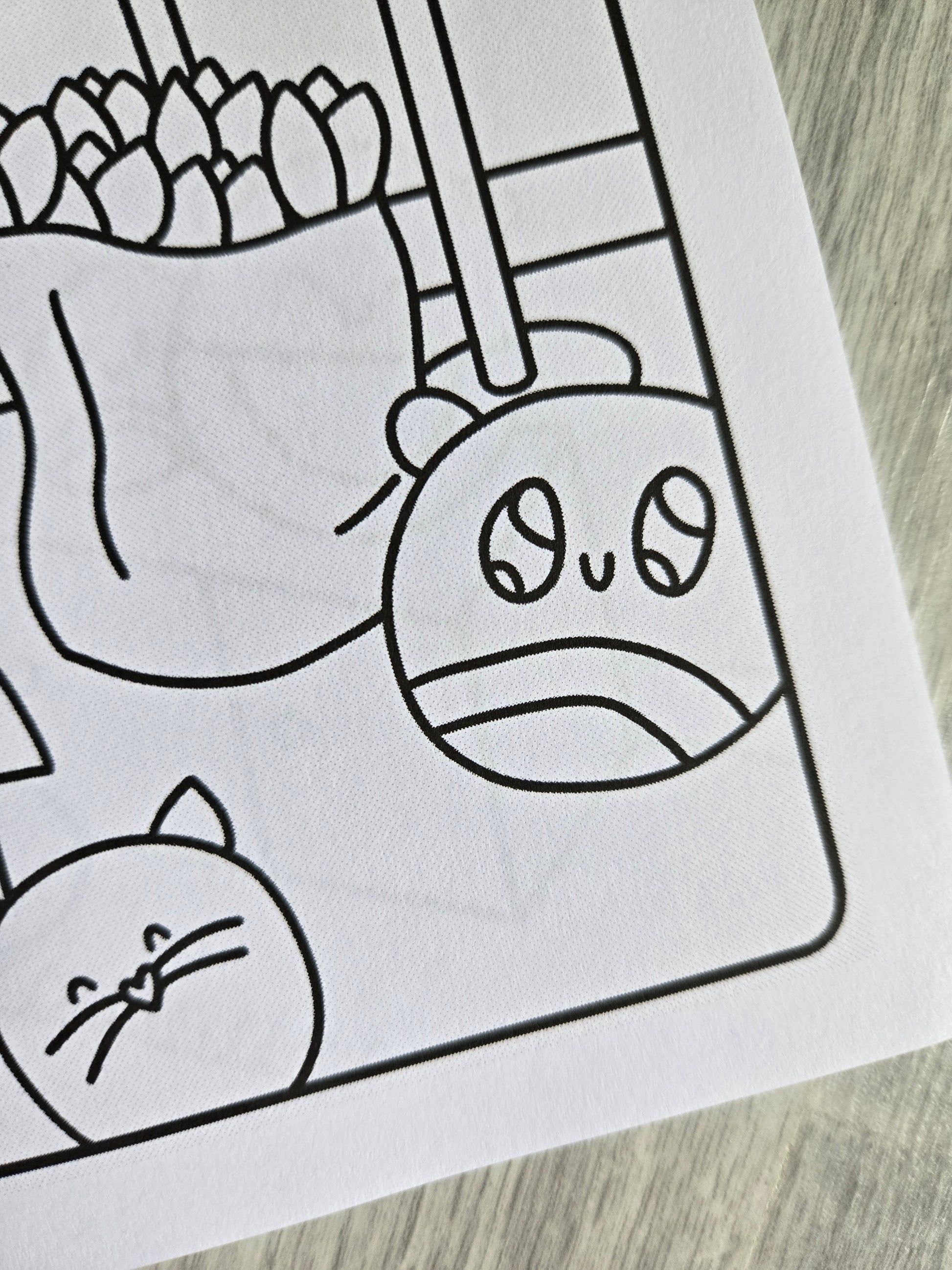 - Enkeltsidet illustrationer for at undgå bleed. Tip: læg et stykke papir, plastiklomme eller pap bag den side du farvelægger, hvis du farver med tus.